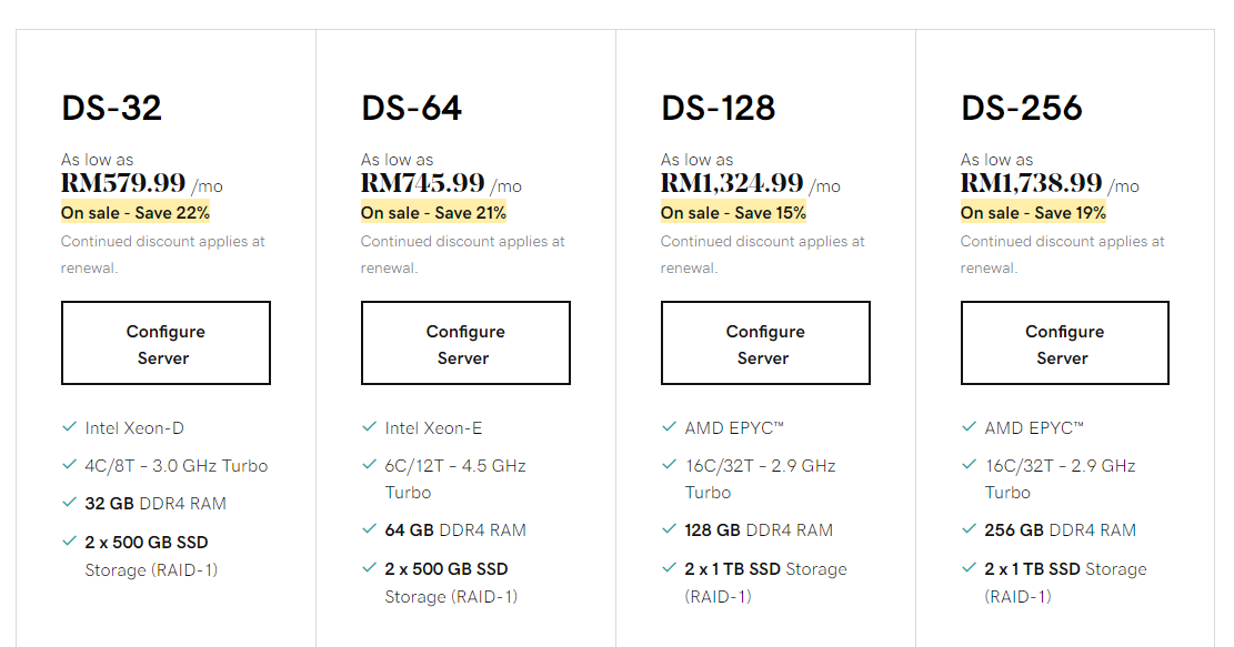 A2 Hosting menyediakan 4 pelan dedicated server hosting. Antaranya:-